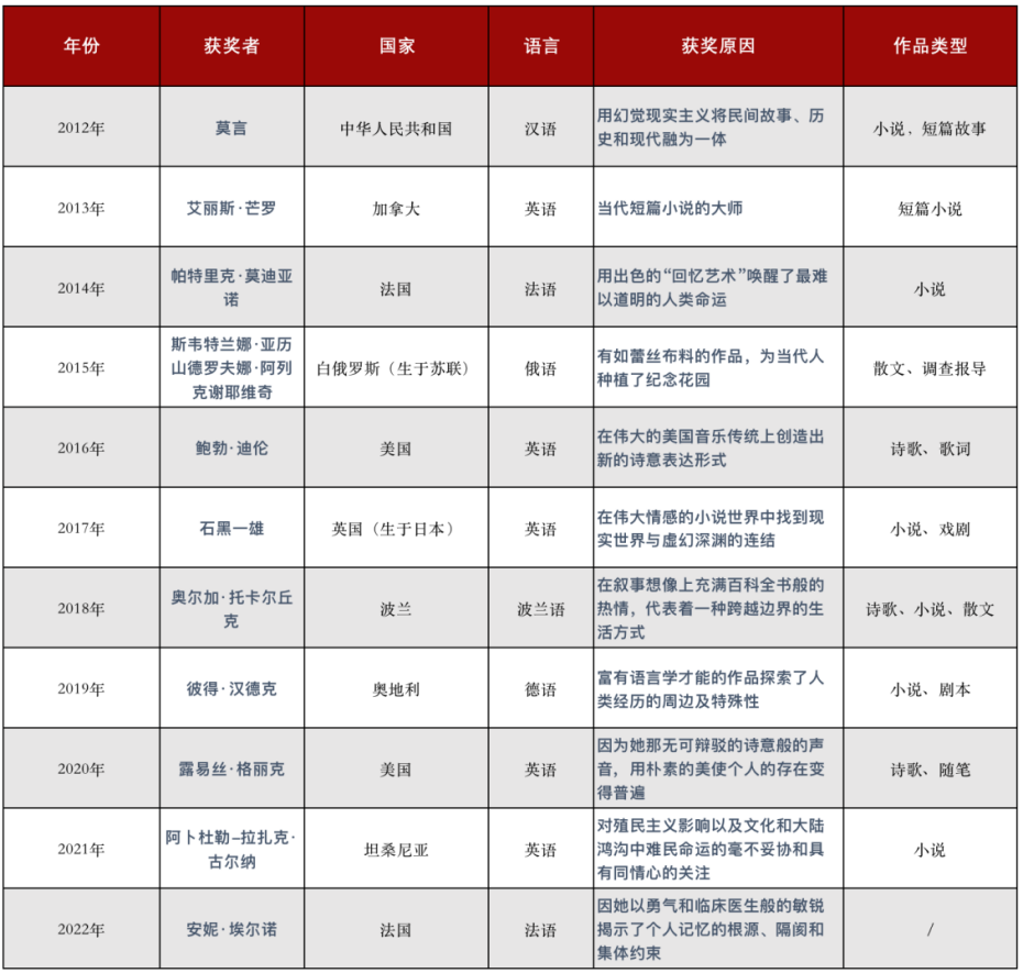 近十年诺贝尔文学奖得主汇总